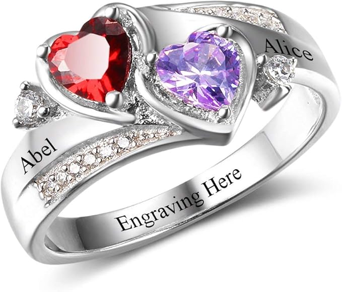 925 Sterling Silver Engagement Promise Ring For Her 2 Heart Birthstones 2 Names 1 Engraving Customized Personalized